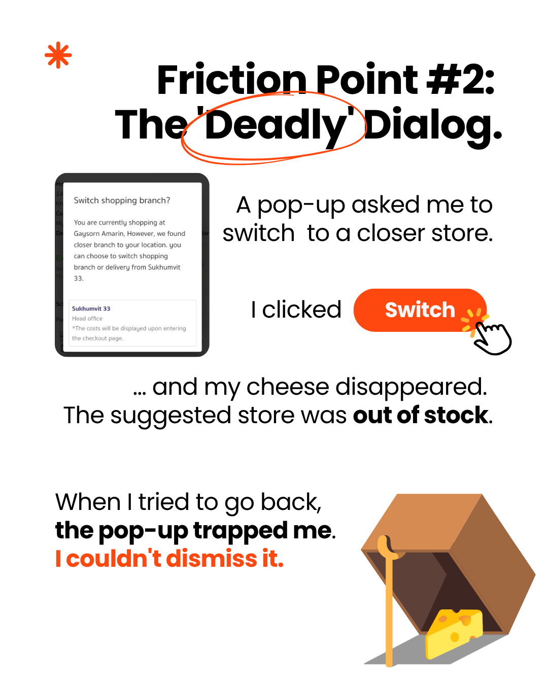 I was at the finish line. The credit card was out. This is the moment every business dreams of—and the moment their app decided to kick me out of the store. And just as I was about to press “Pay” - a window (dialog in mobile terminology) pops-up asking me if I want to switch to store that is closer to me. Ooooh, a nice little optimization I thought. Don’t mind if I do. I press “Switch” - and my cottage cheese dissapears….. Ehhhh what?
