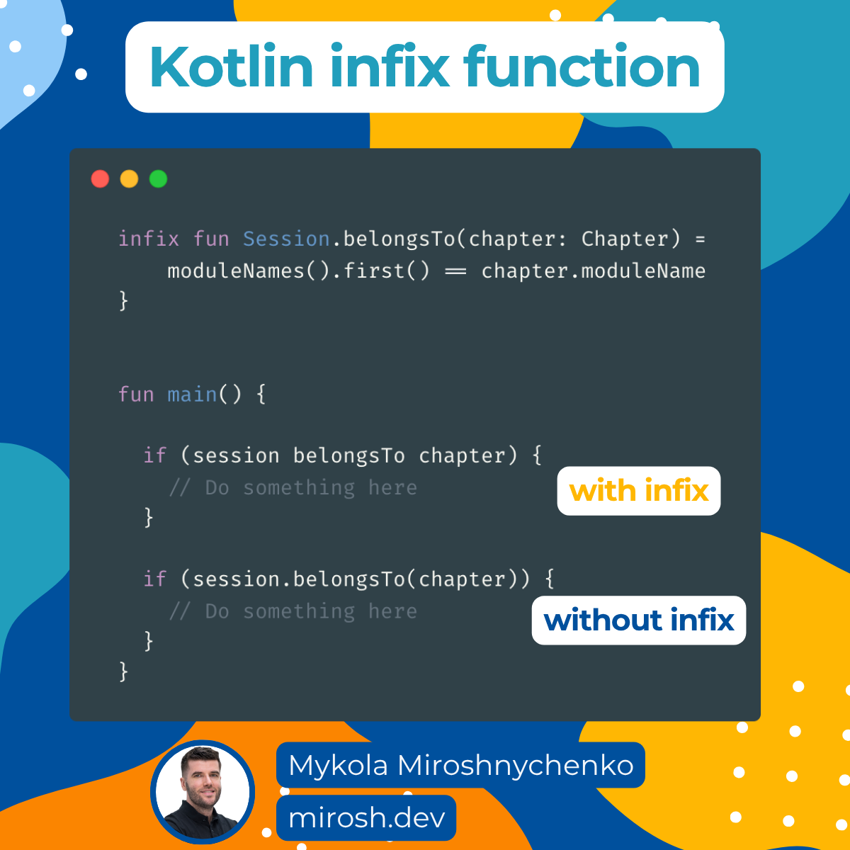 In the example below, I use the belongTo() function both with and without infix notation. As you can see, the infix function removes the extra parentheses. Infix makes expressions a bit more readable, and it can make a difference in a large codebase.