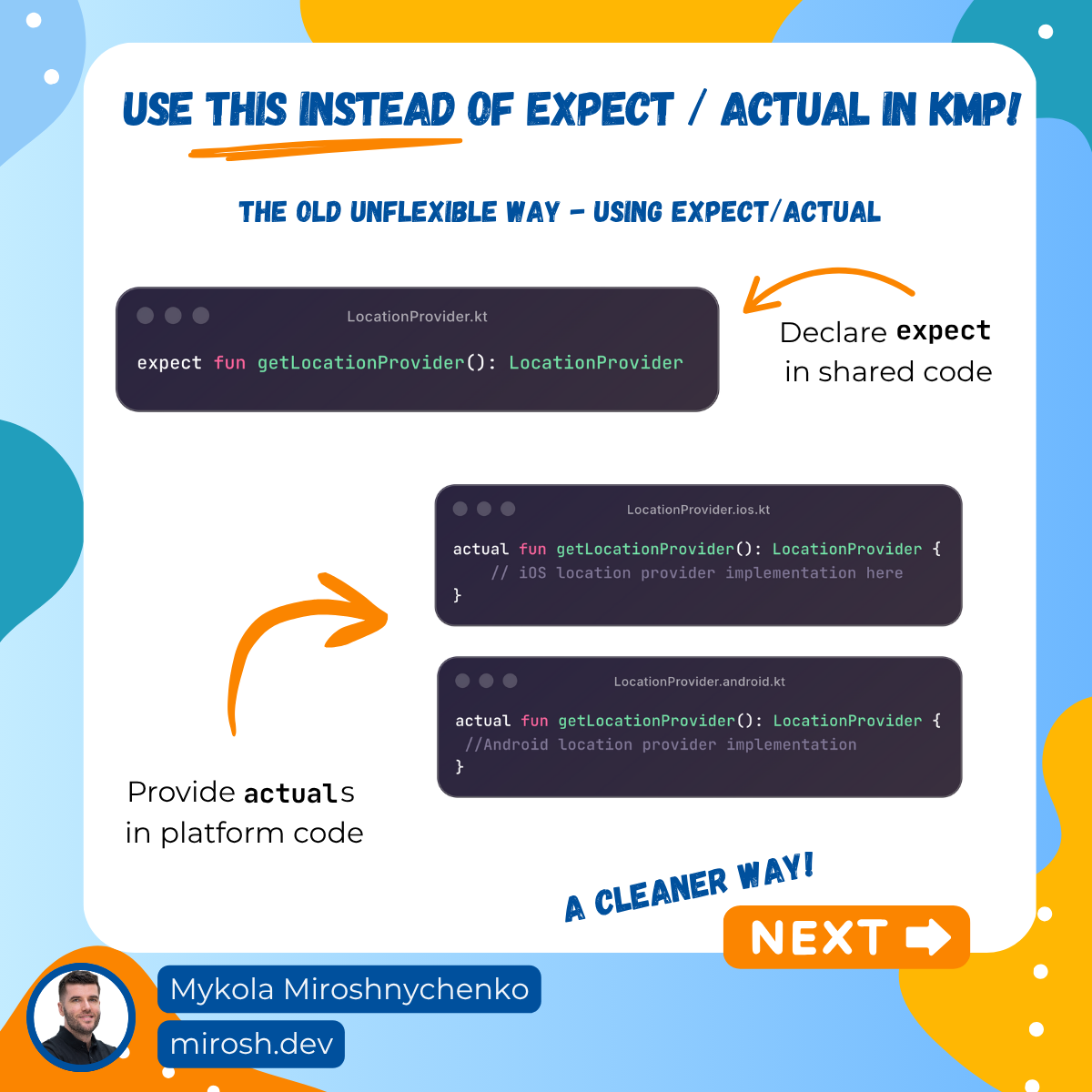 Expect/actual is great when your project is small. However, as your codebase grows, managing platform-specific dependencies quickly becomes a headache.